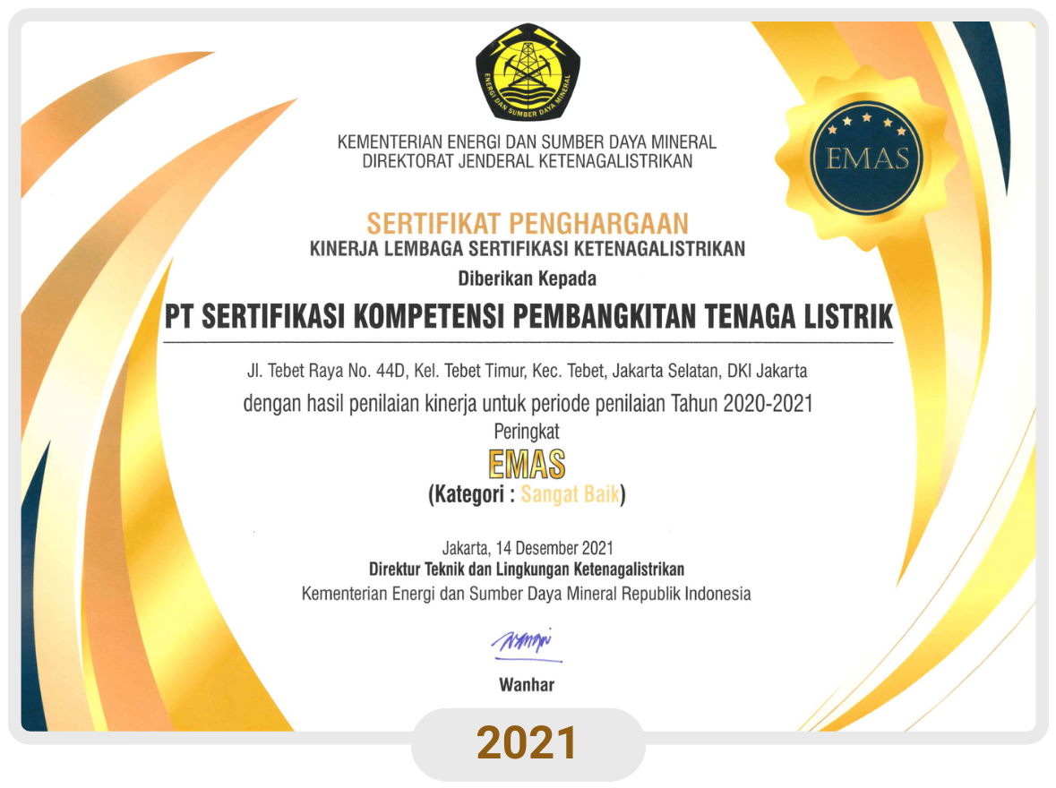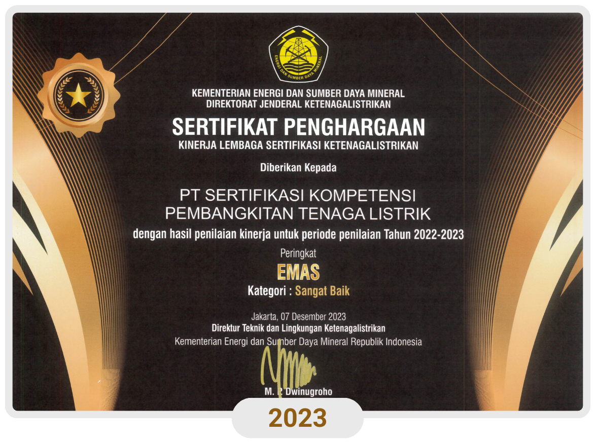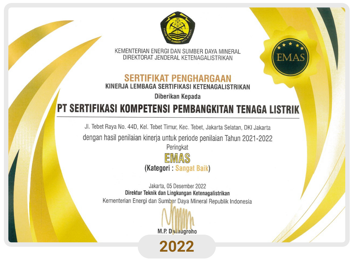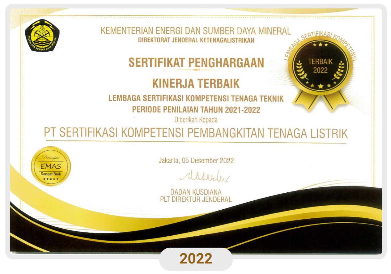 PT SKP Tenaga Listrik memperoleh penghargaan sebagai Lembaga Sertifikasi Kompetensi Tenaga Teknik Kinerja Terbaik Tahun 2022 oleh Kementerian ESDM Direktorat Jenderal Ketenagalistrikan (DJK).