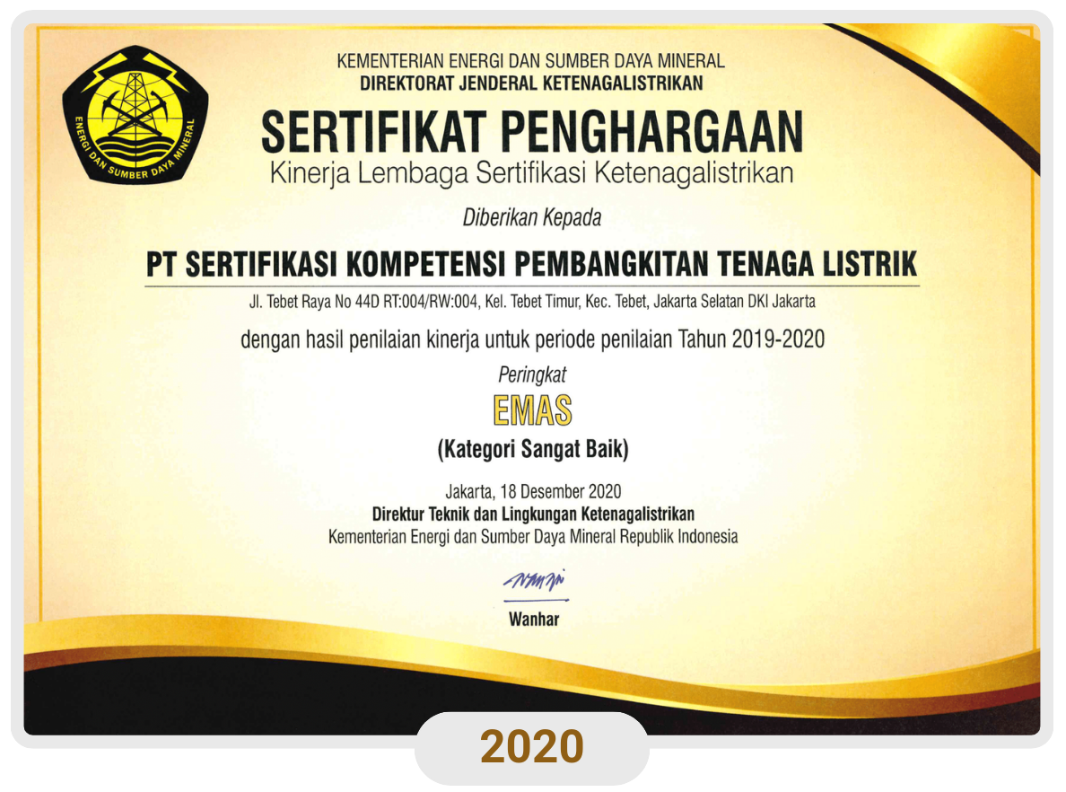PT SKP Tenaga Listrik 6 tahun berturut-turut memperoleh penghargaan sebagai Lembaga Sertifikasi Ketenagalistrikan Peringkat Emas dengan Kategori Kinerja Sangat Baik oleh Kementerian ESDM Direktorat Jenderal Ketenagalistrikan (DJK).