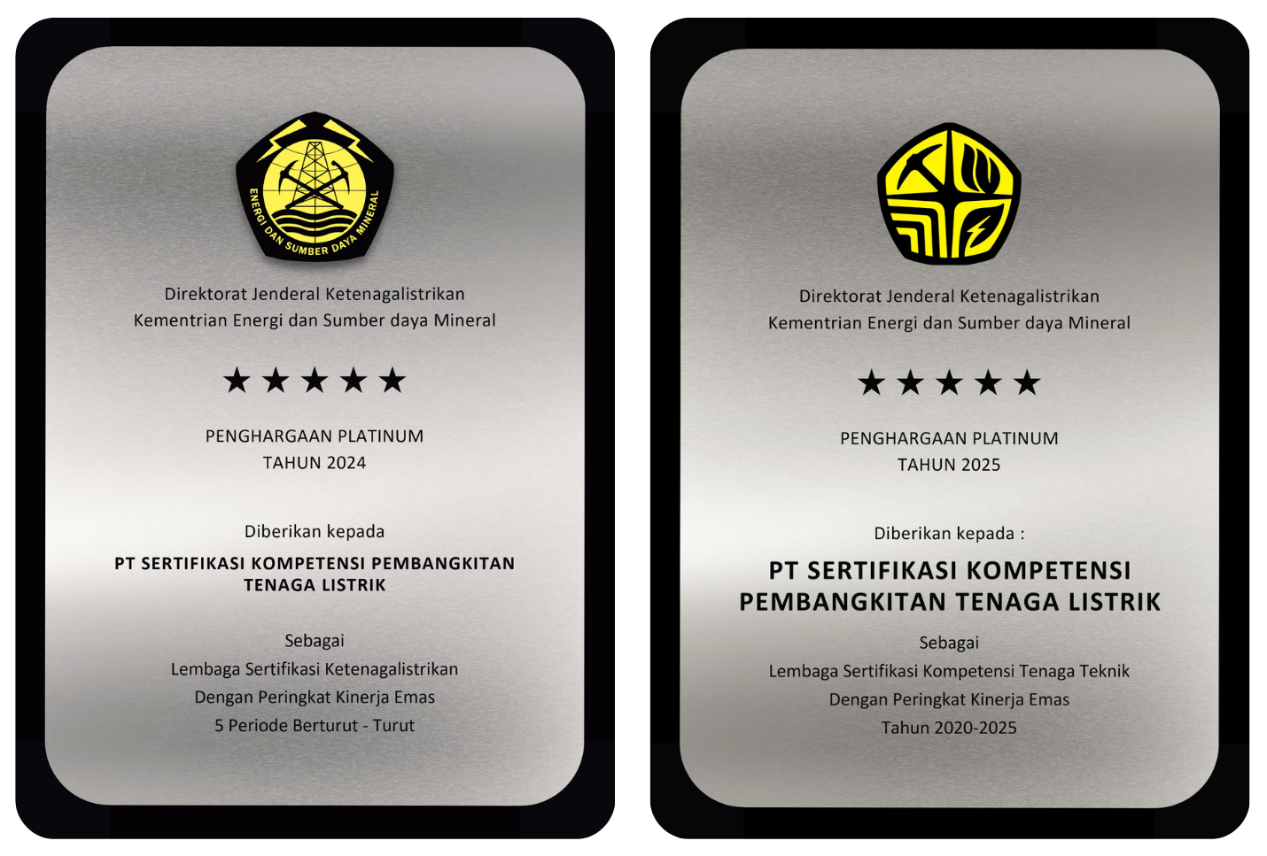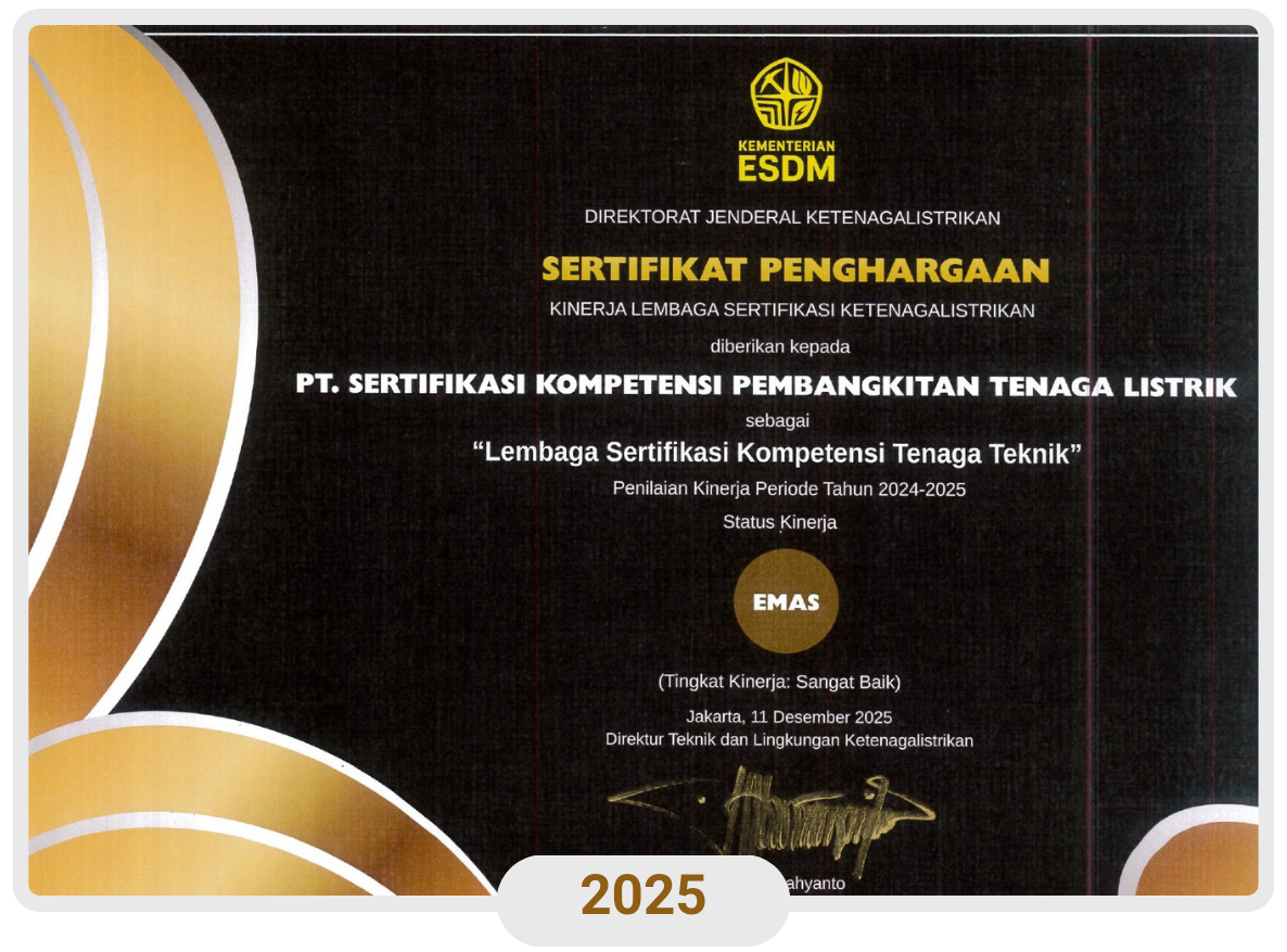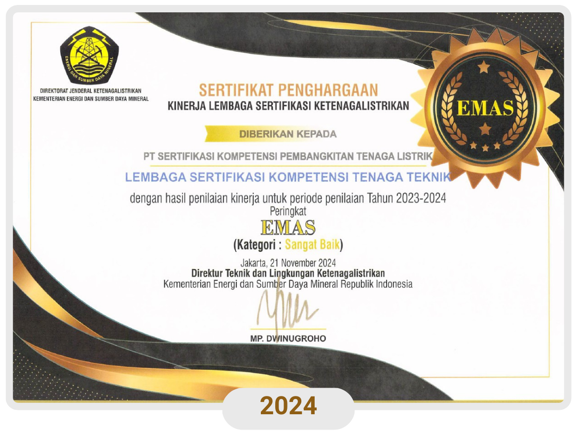 Penghargaan Platinum Tahun 2024 & Tahun 2025 diberikan kepada PT SKP Tenaga Listrik karena selama 6 tahun berturut-turut memperoleh penghargaan sebagai Lembaga Sertifikasi Ketenagalistrikan Peringkat Emas dengan Kategori Kinerja Sangat Baik oleh Kementerian ESDM Direktorat Jenderal Ketenagalistrikan (DJK).